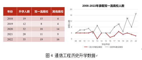在考研升学率方面,本专业在2008~2022的15年间,总计招生33个班,约990人,共计考取研究生 258人,平均升学率为26%。其中,2020届升学率为49%、2021届升学率为29%、2022届升学率为43%,近三年平均升学率为40.1%。